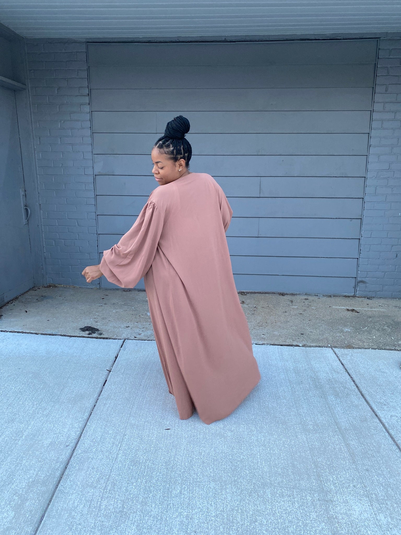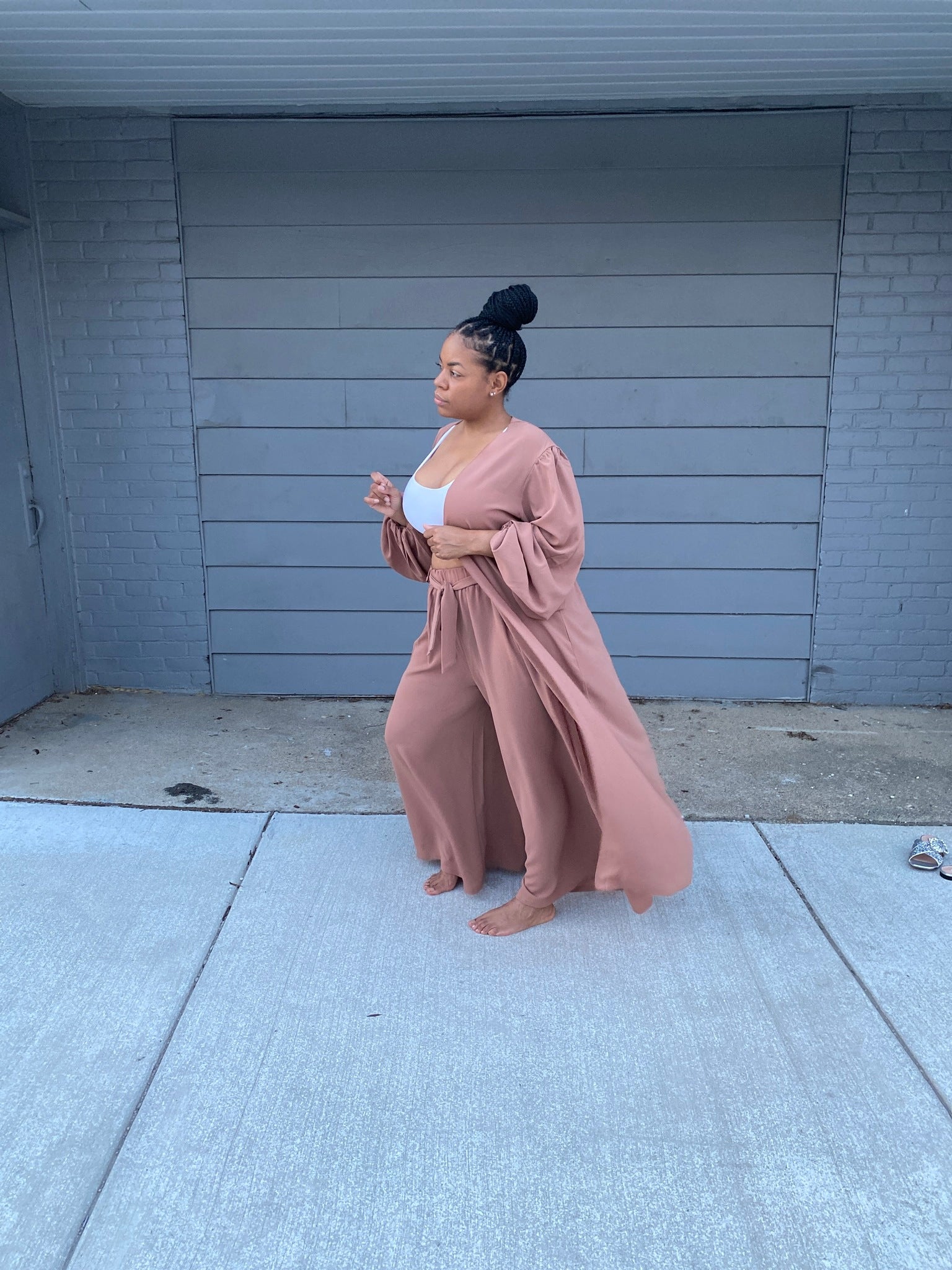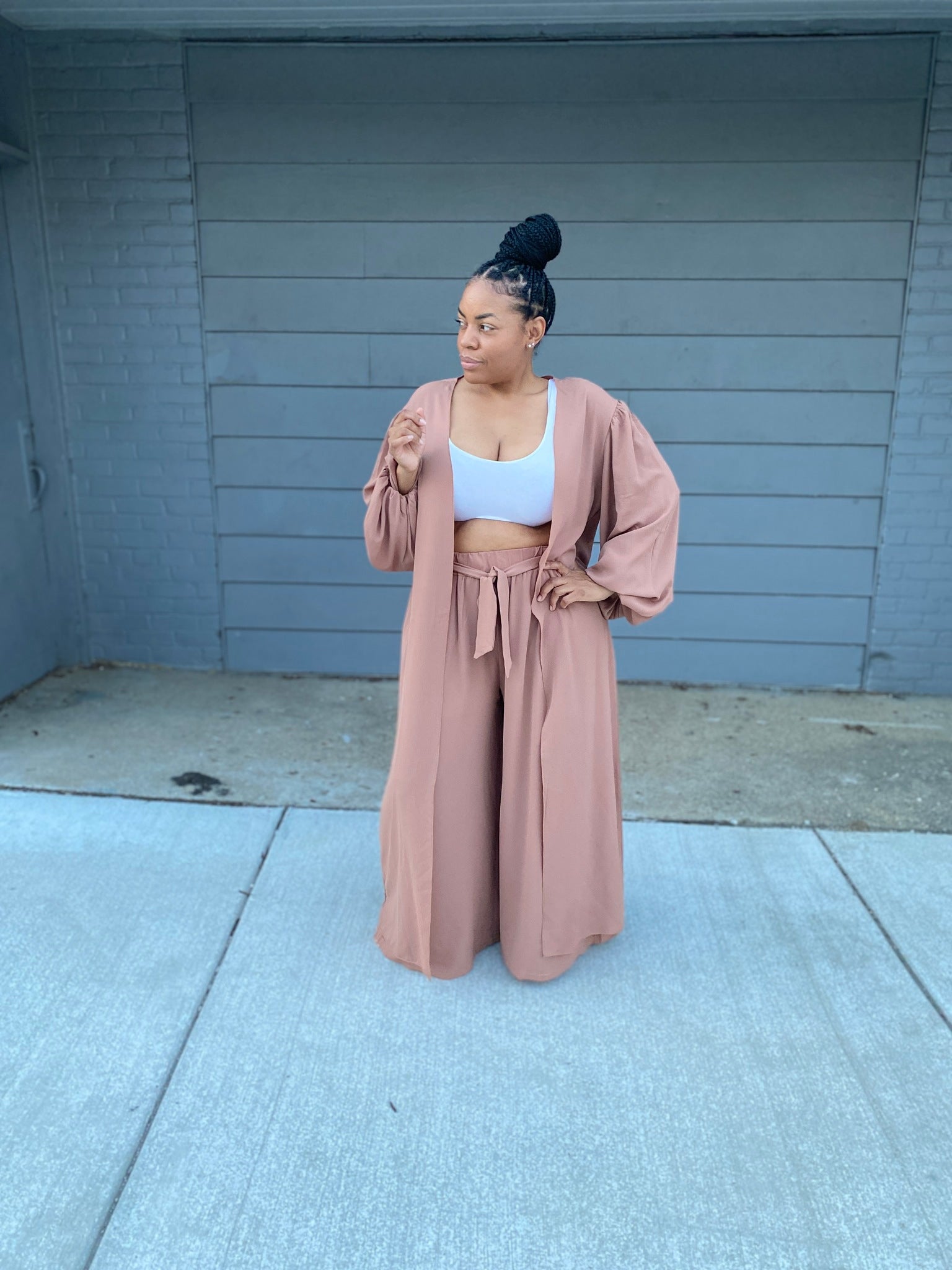 Maxi duster with palazzo pant set. Elastic waist and very free flowing. Lightweight material. Model is wearing a large.