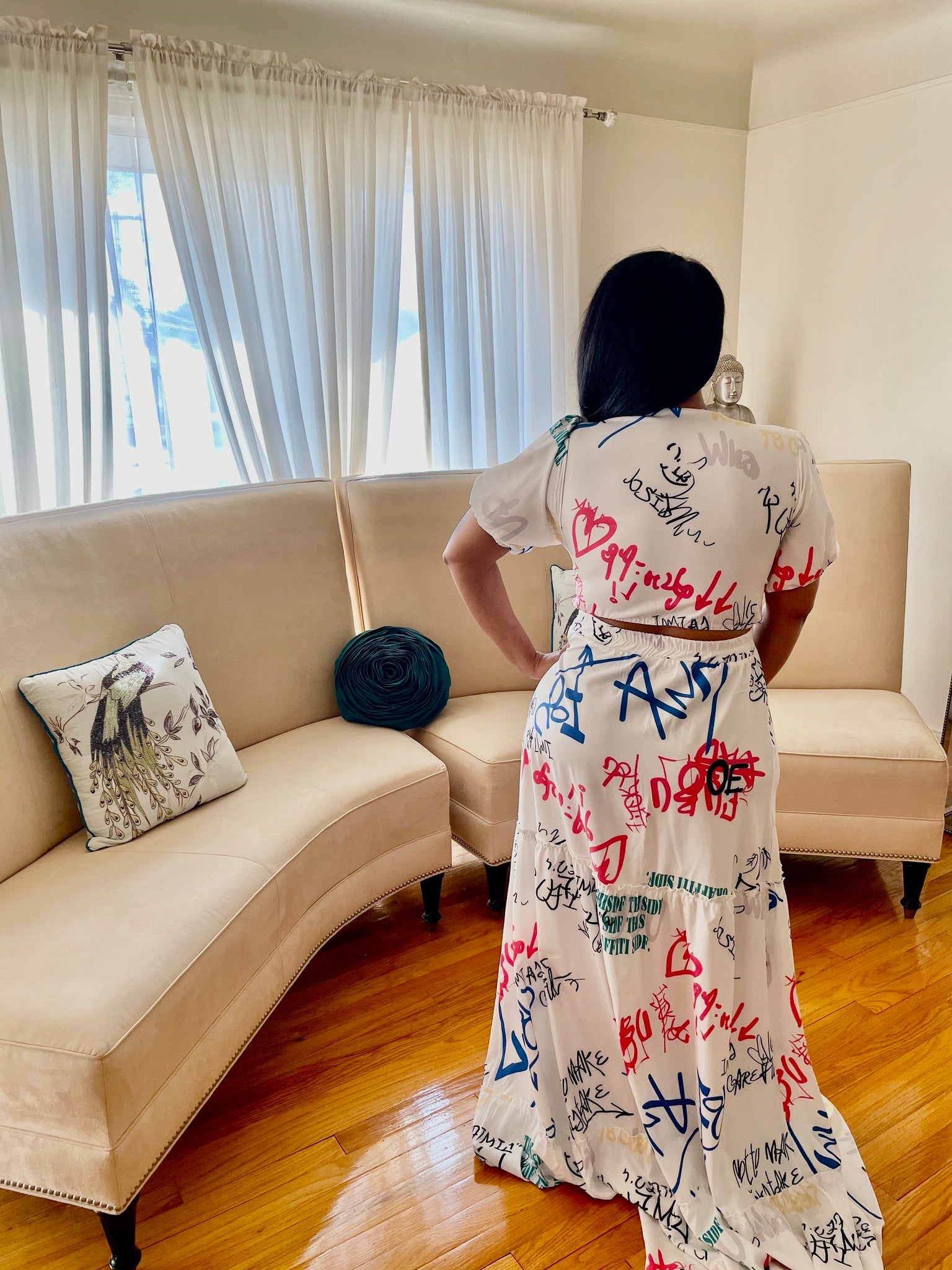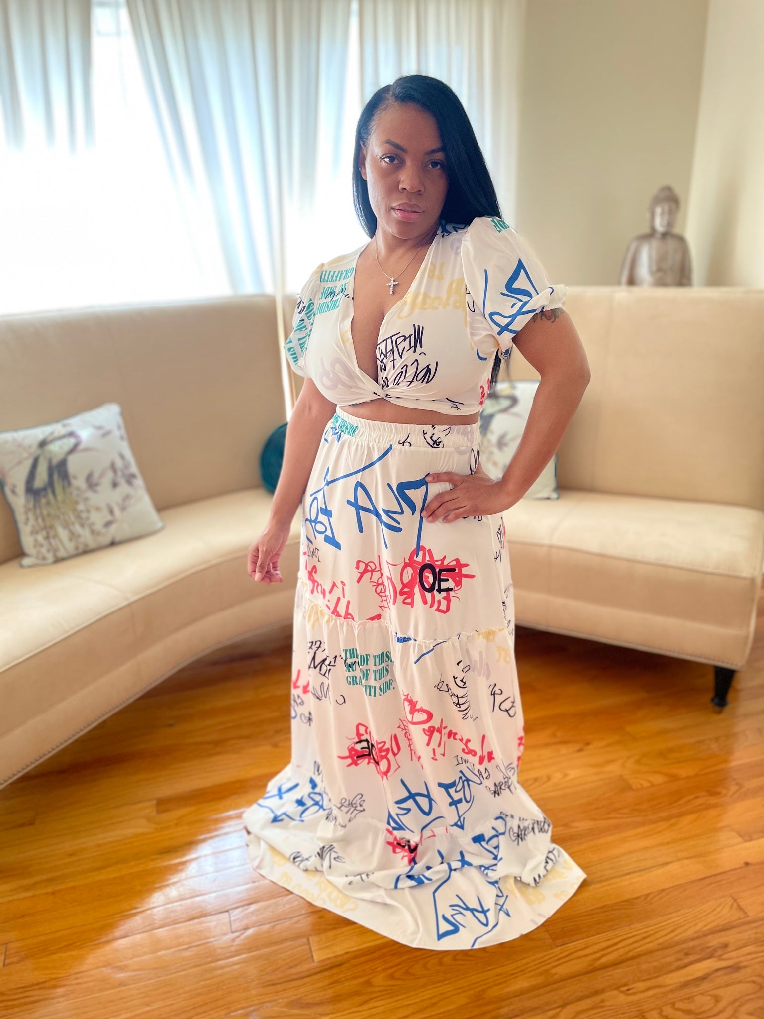 Graffiti two piece maxi skirt set. Model is wearing a medium