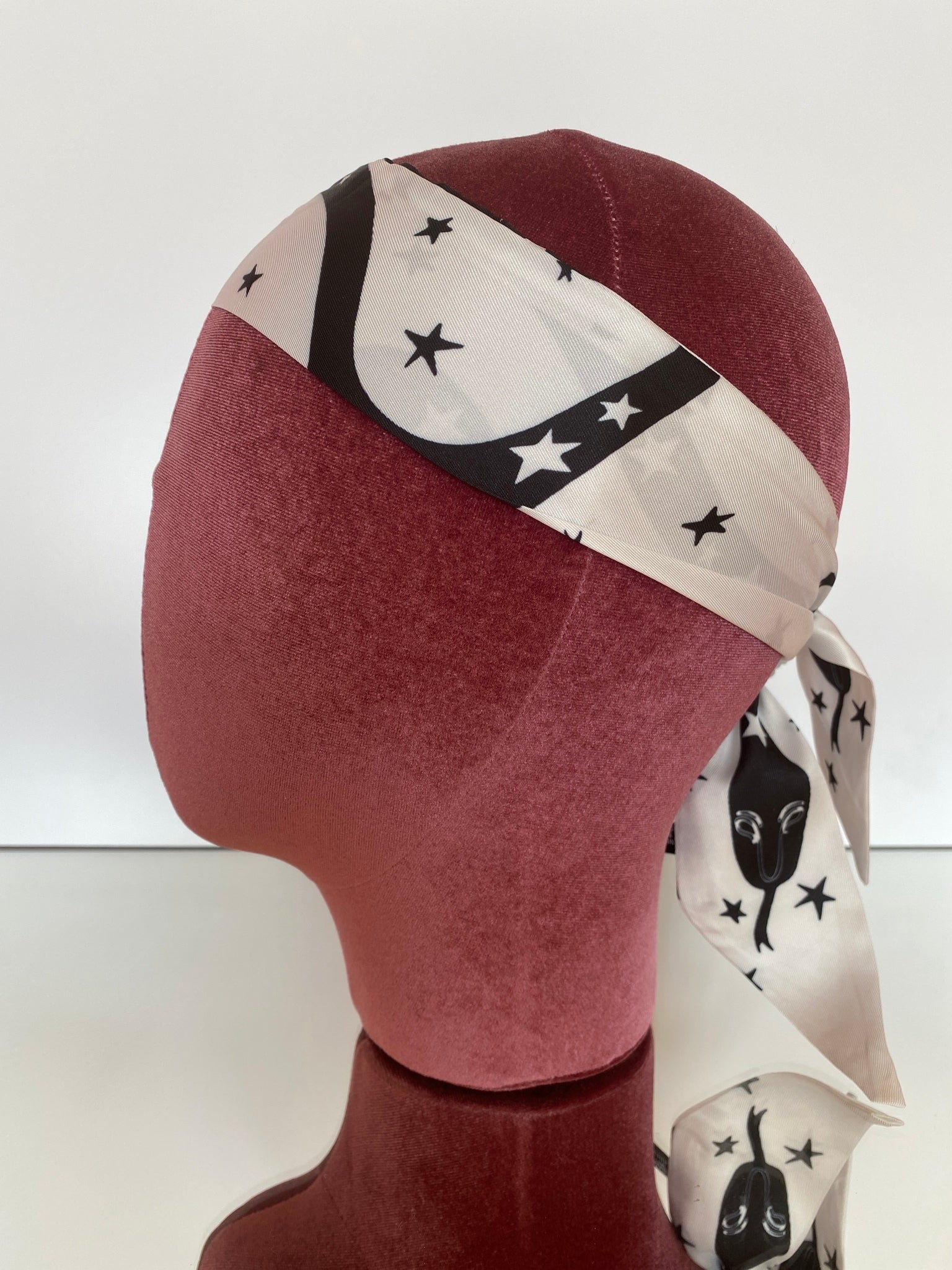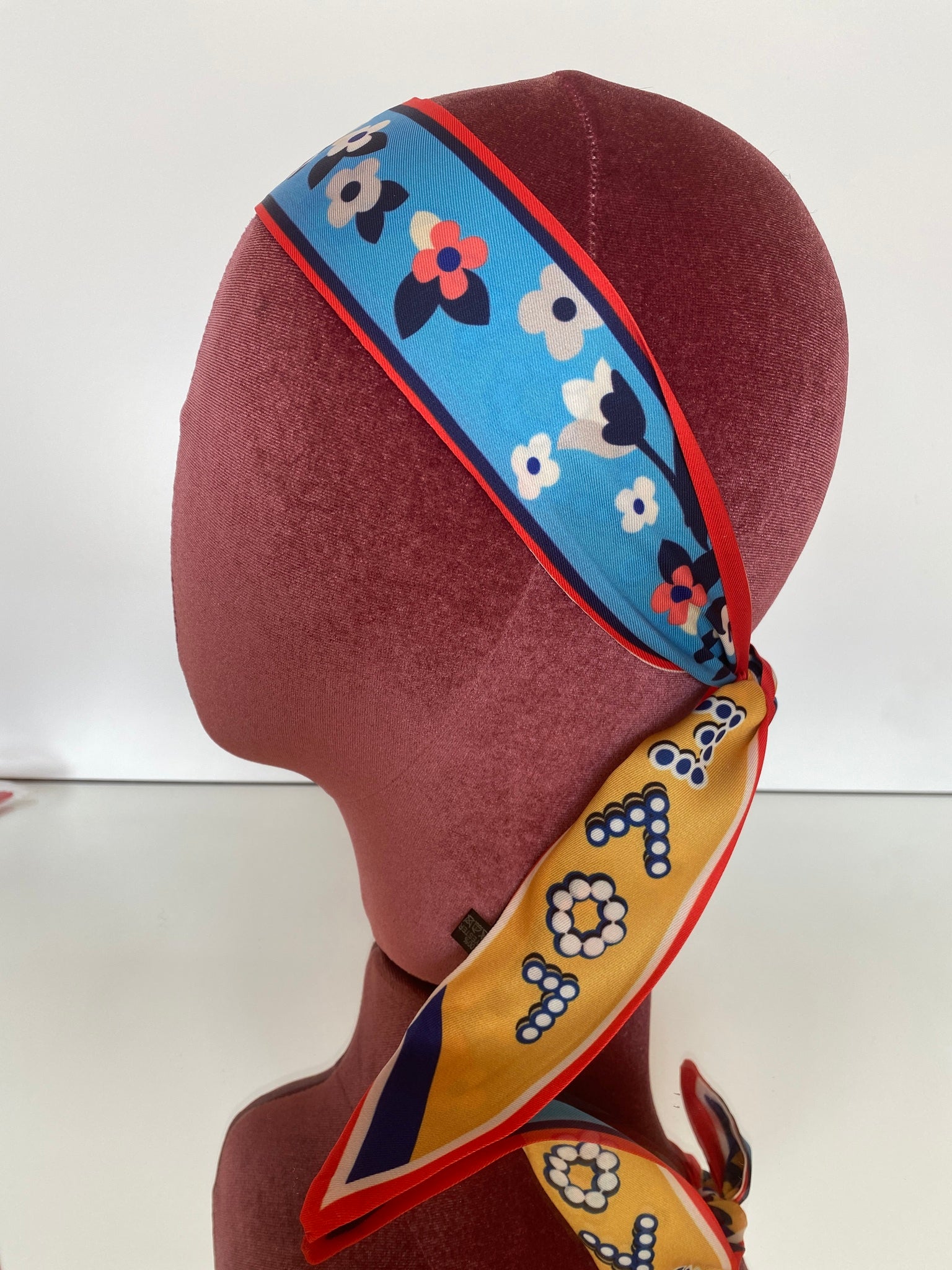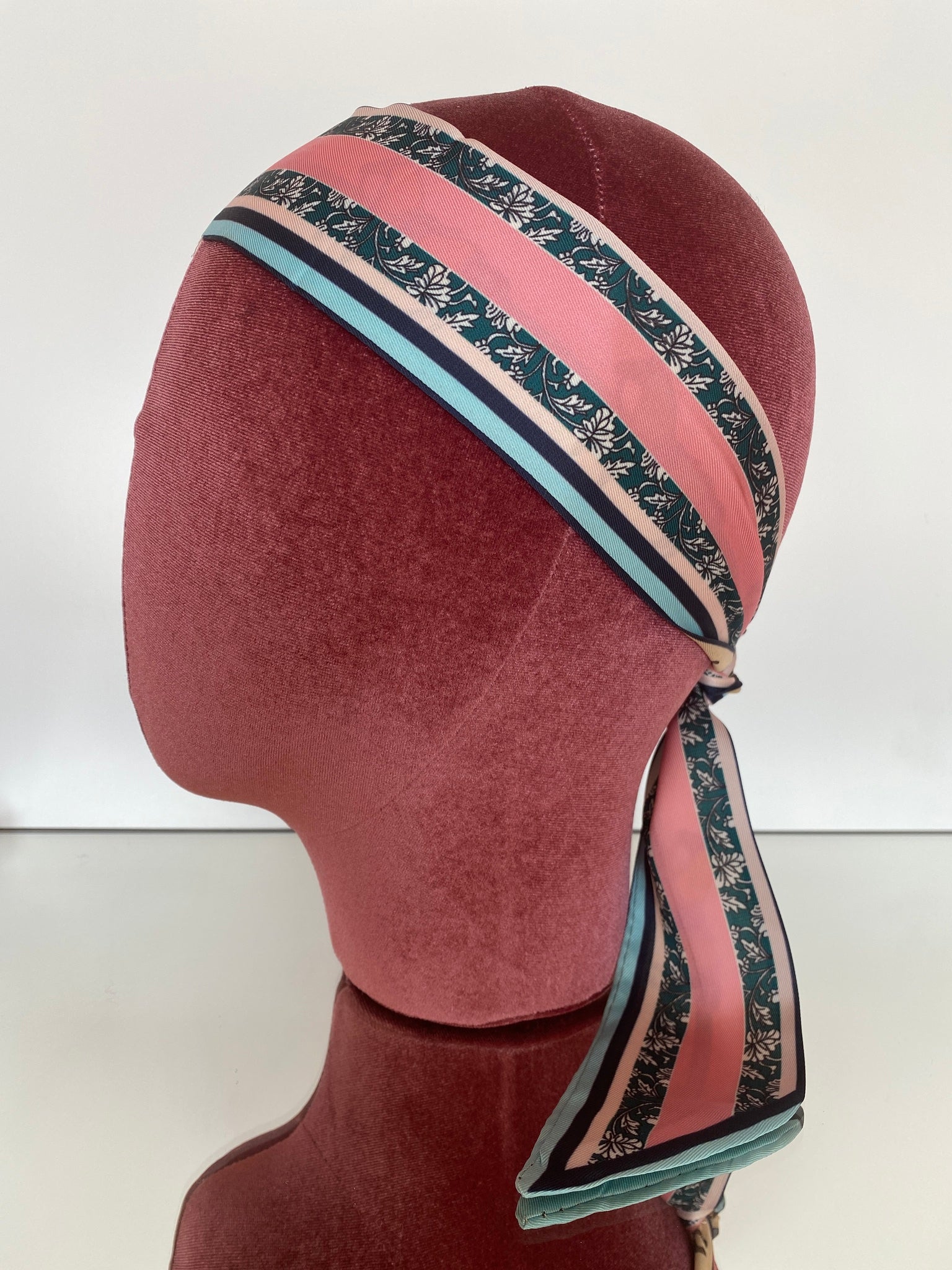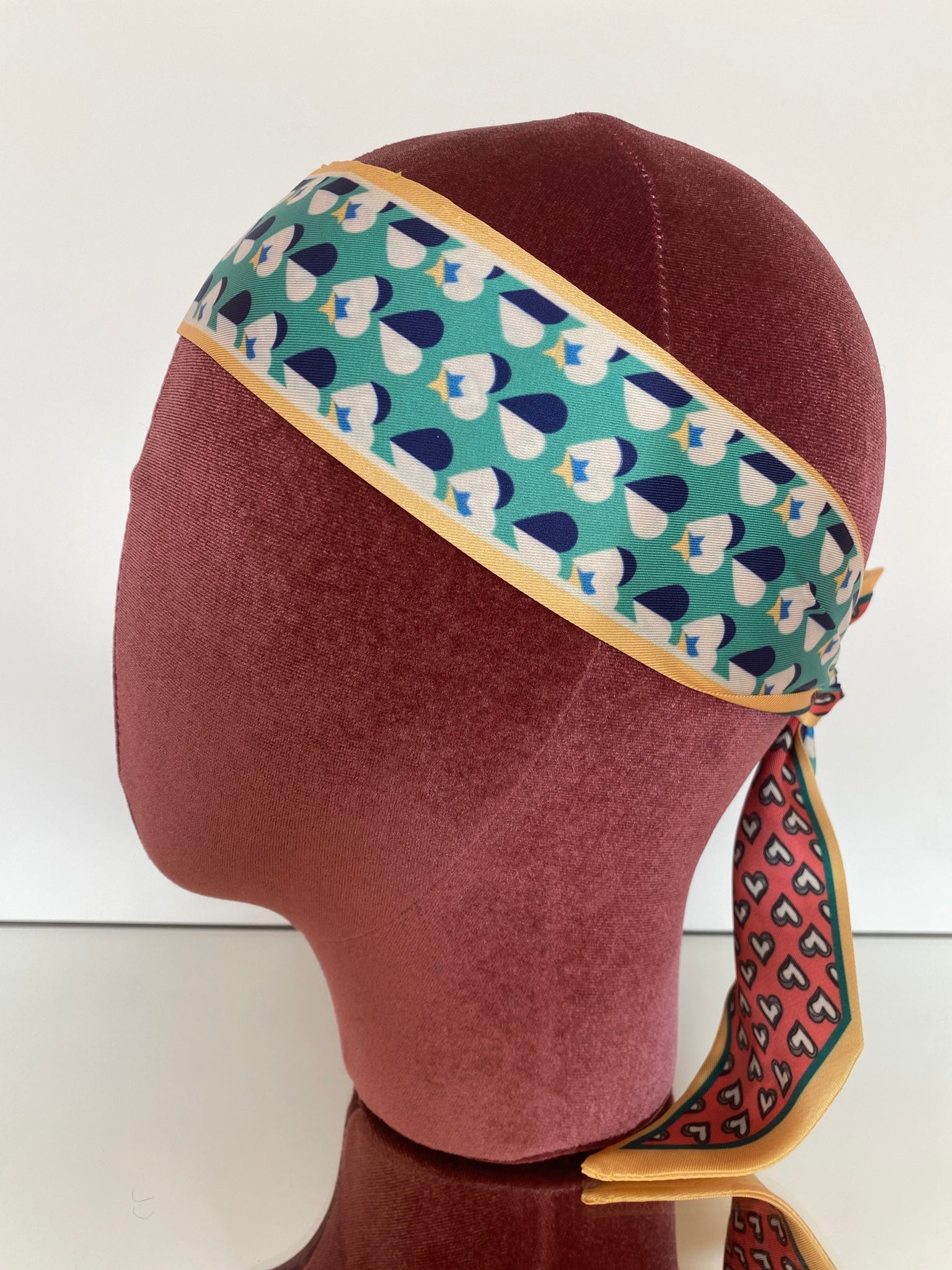 Silk blend, double-sided twilly headband. Different print on each side. Shorter in length than our Hair So Chic headband.