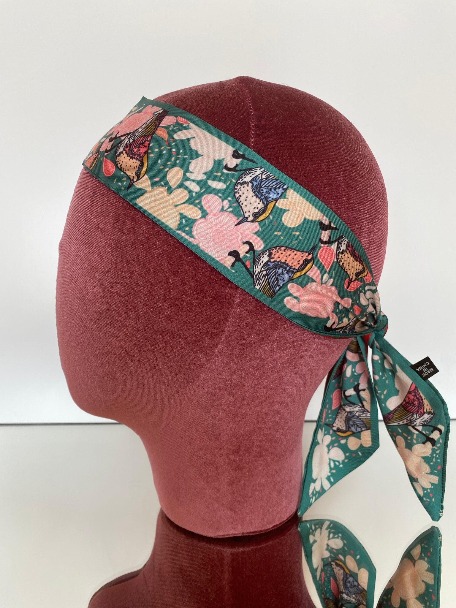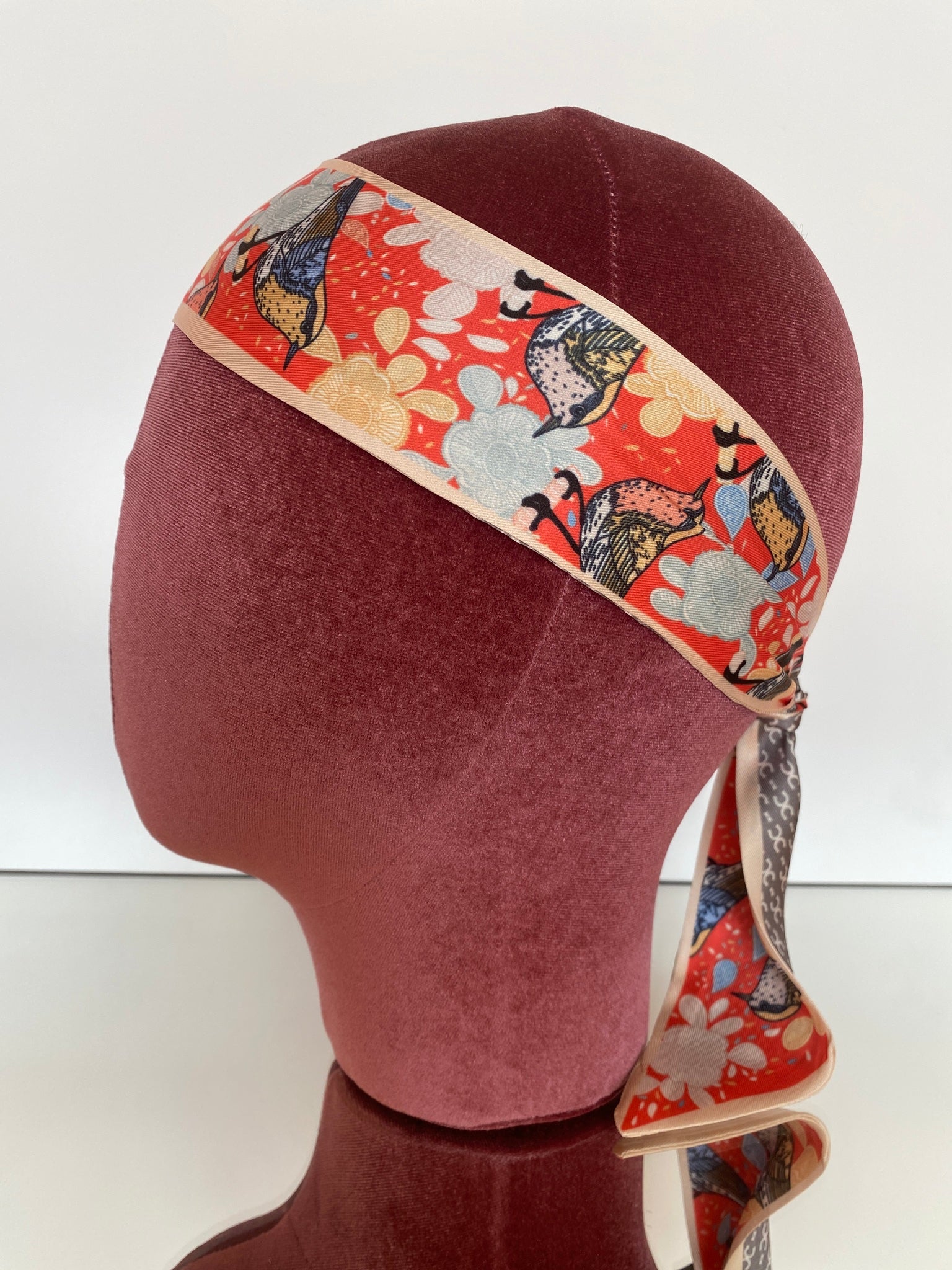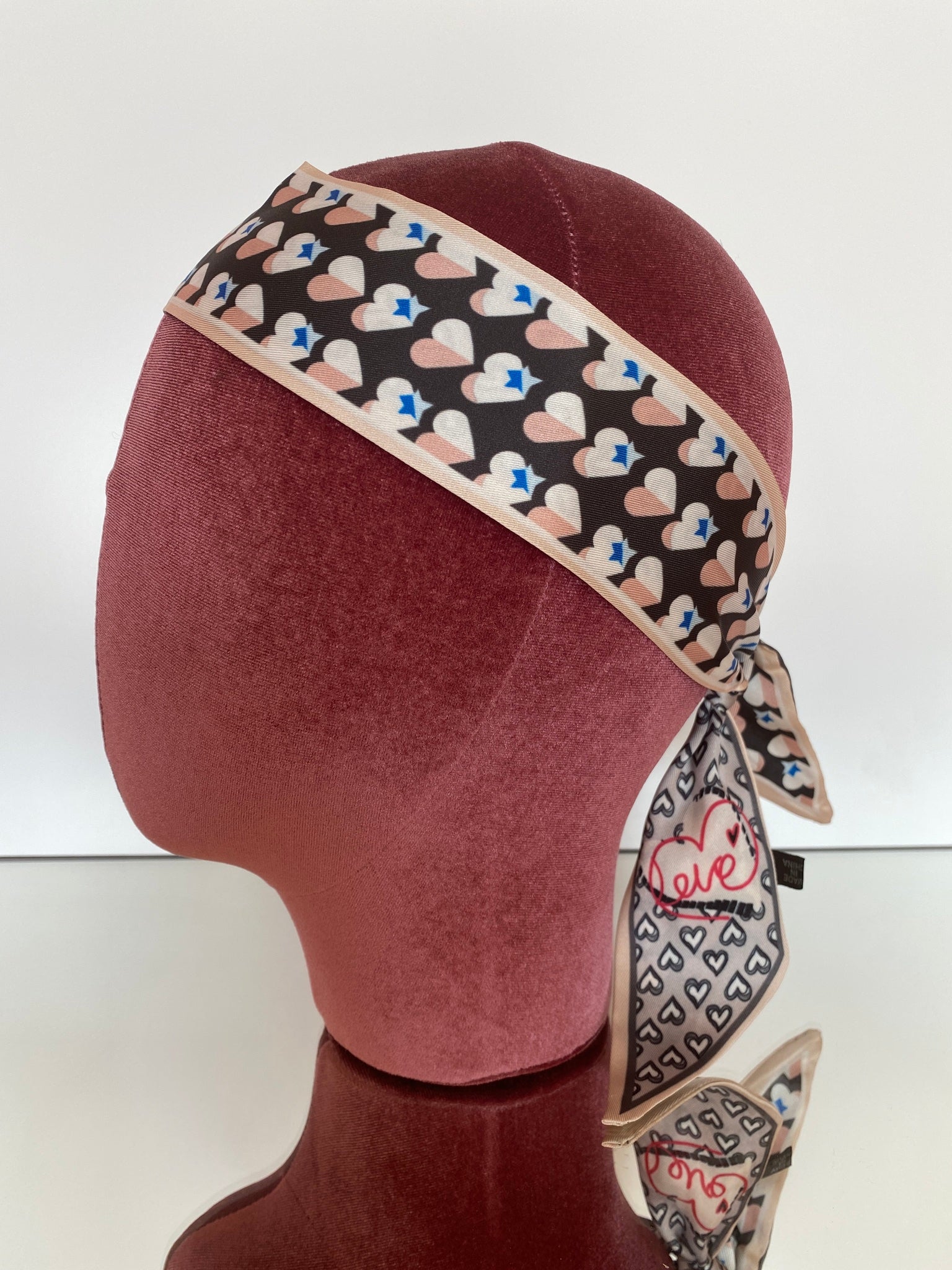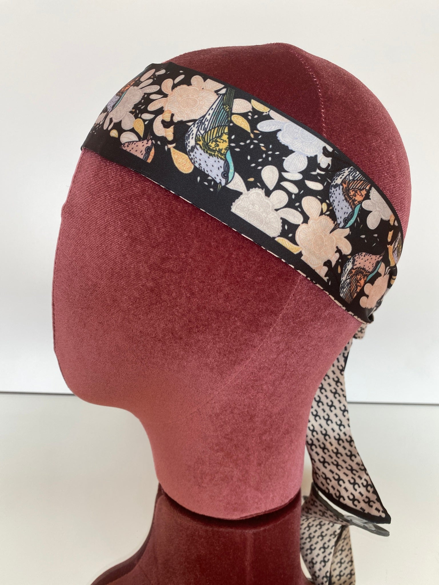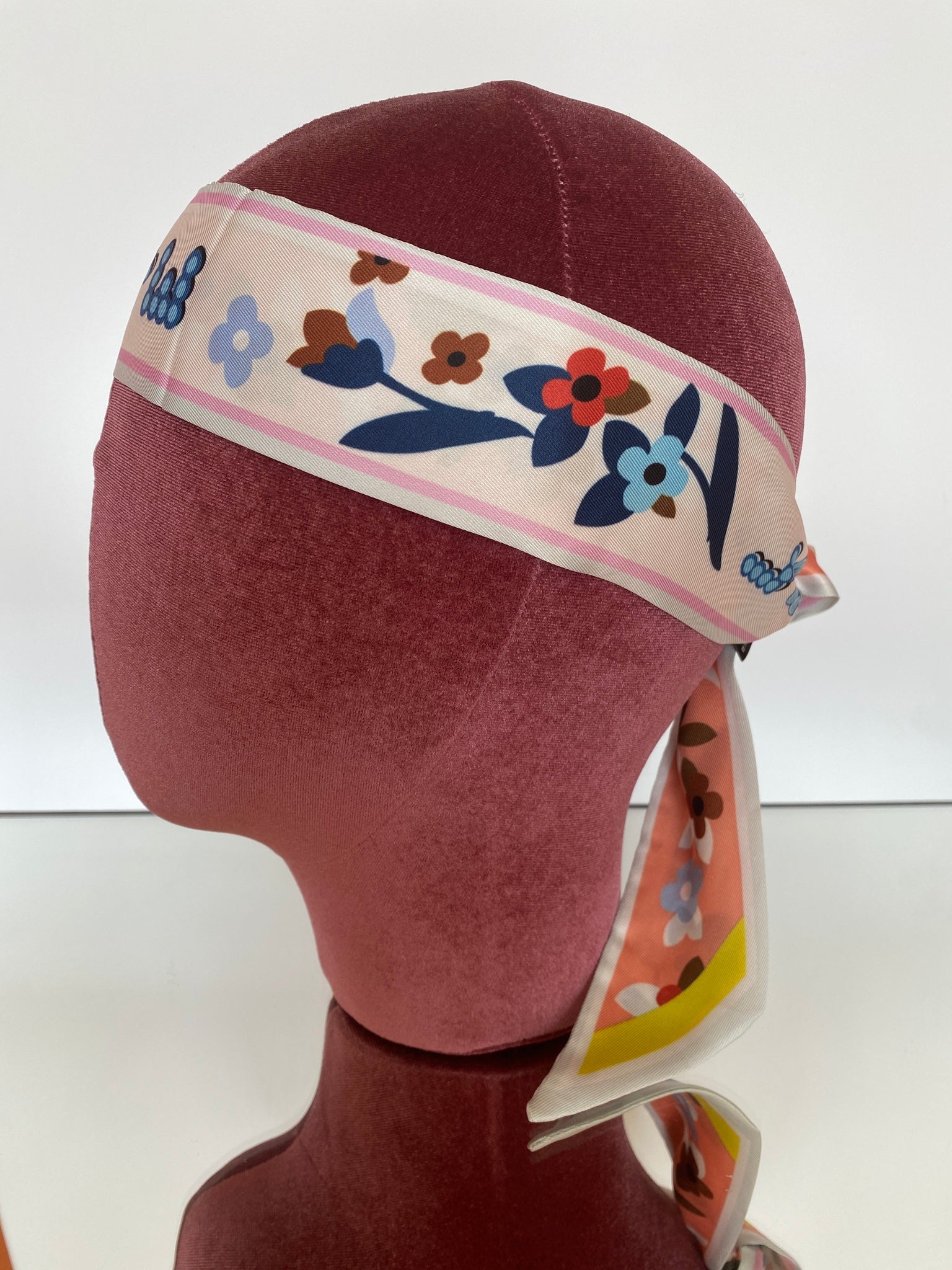 Silk blend, double-sided twilly headband. Different print on each side. Shorter in length than our Hair So Chic headband.