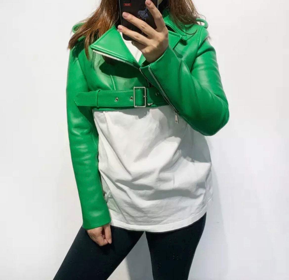 Lambskin cropped moto jacket with belt trim and arm zippers