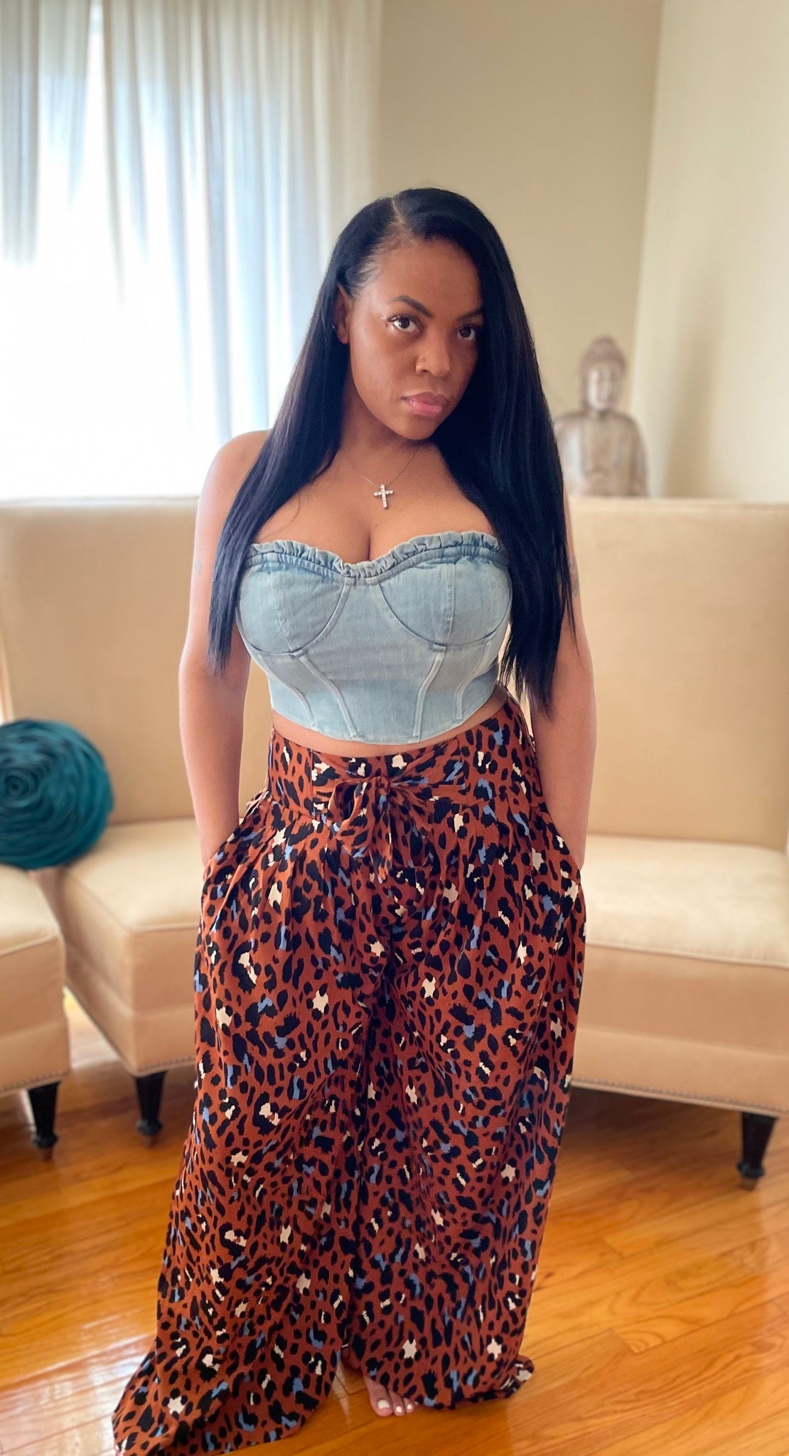 Leopard palazzo pant. Tie front with elastic back waist. Model is wearing a small.