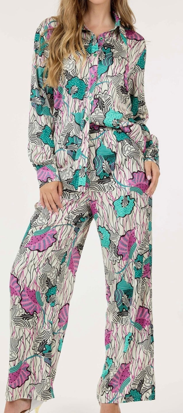 Silk blend graphic printed long sleeve pant set. Wide leg pant with button/zip waist and elastic back. Long sleeve button down blouse. Set has no stretch