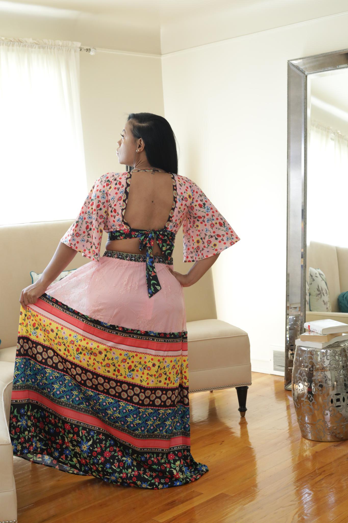 Tie back top. Elastic waist skirt