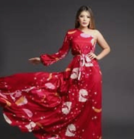 Printed one arm maxi dress with ruffle trim, side zip, and tie belt. Dress has minimal stretch