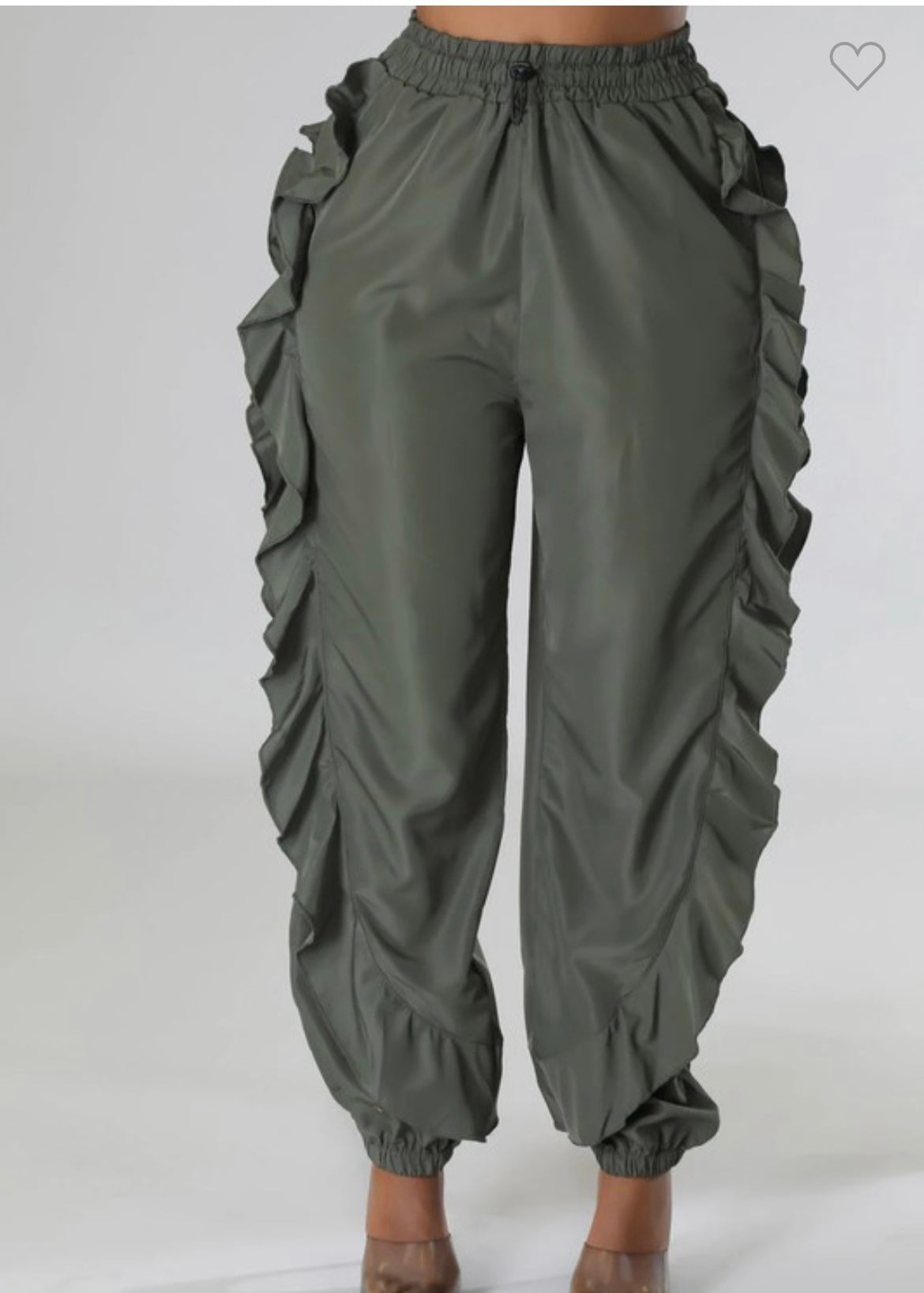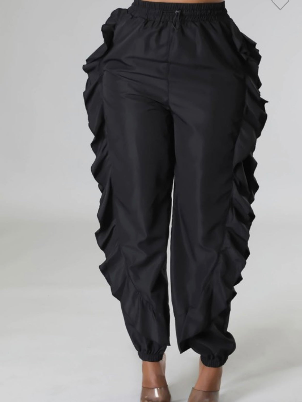 Silky jogger with elastic band and ruffle sides. Minimal stretch