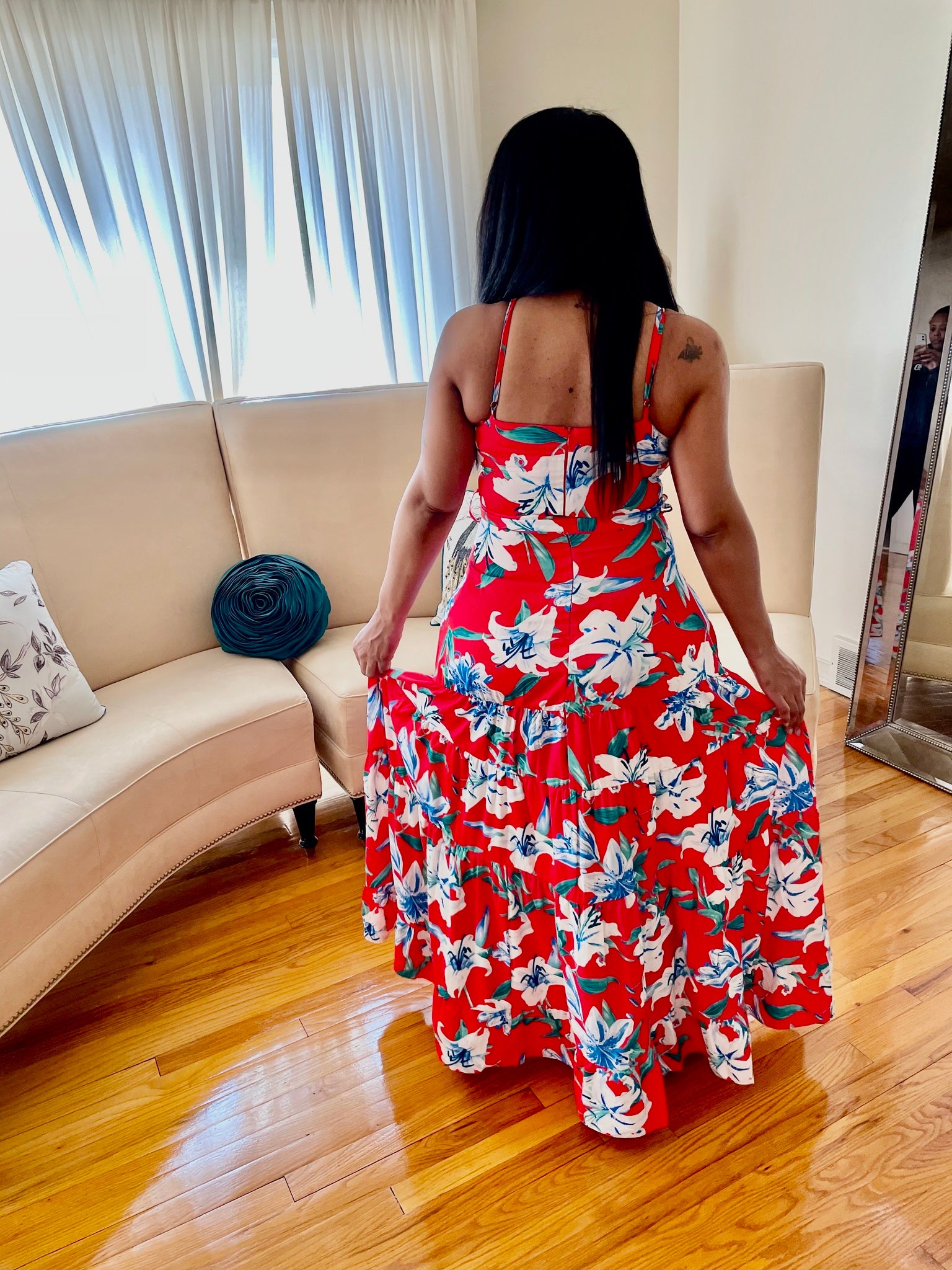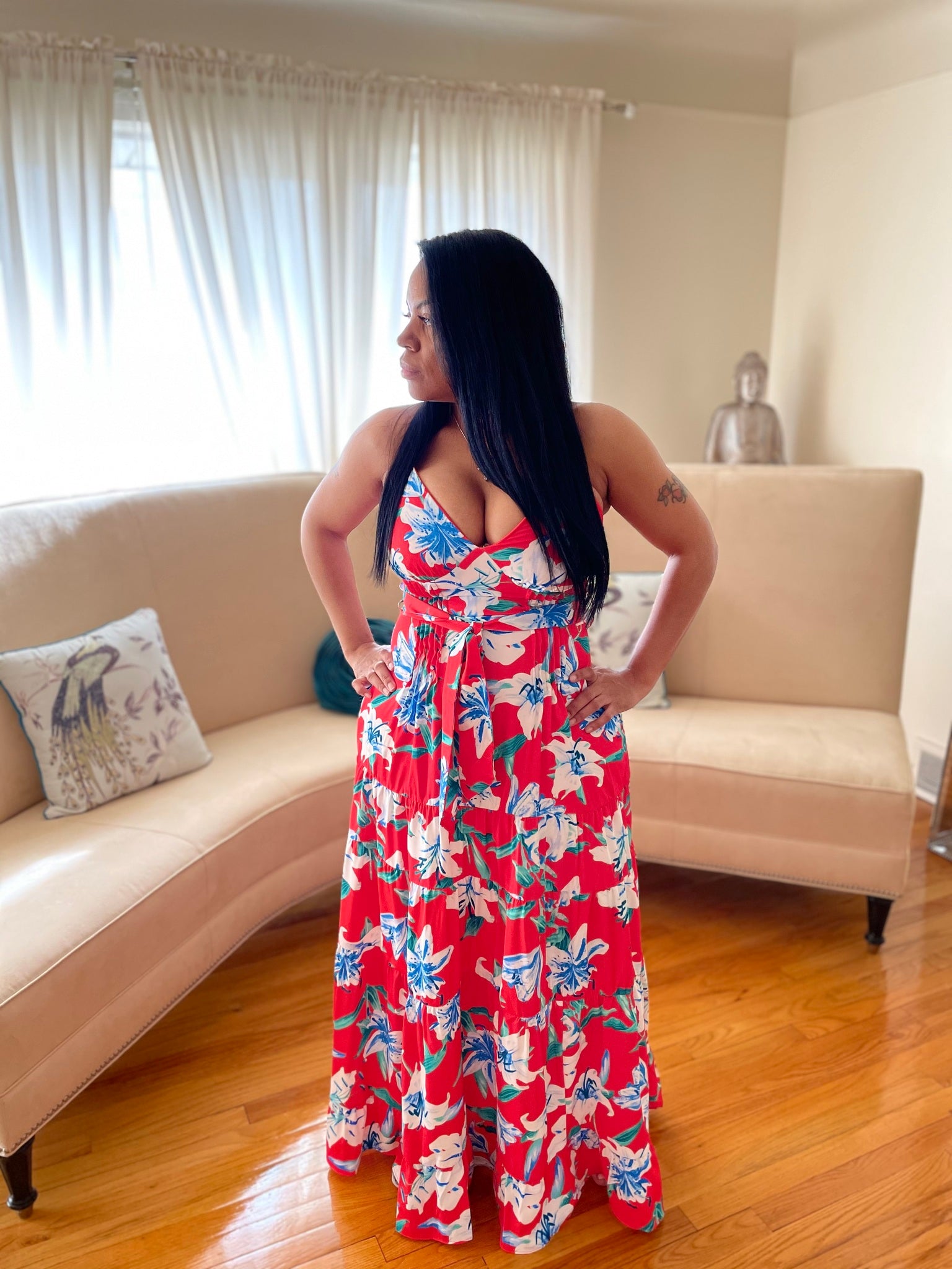 Red floral maxi sundress with adjustable straps. Model is wearing a medium